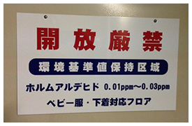ベビー・子供服・下着の「検針」「検品」「たたみ・袋入れ」「補修」などの作業をするフロアーは、ホルムアルデヒド等の「環境基準値保持区域」とし、扉には右の写真にあるよう開放厳禁!