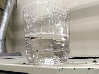 スイッチを入れて3分後に透明な溶剤がこんな色になりました。これは、余分な染料が石油の油性の力で染着力を弱められて溶け出した事によるものです。